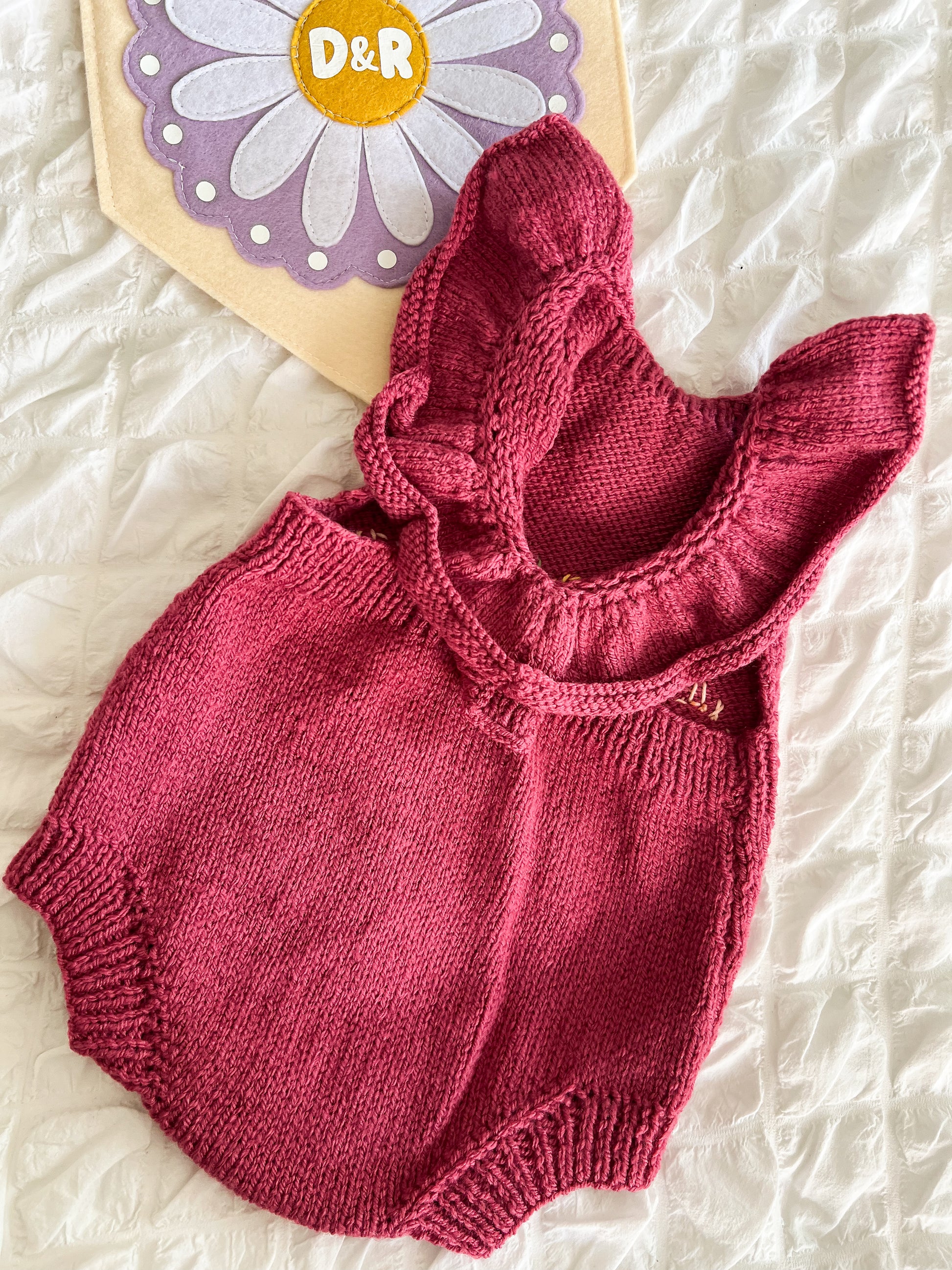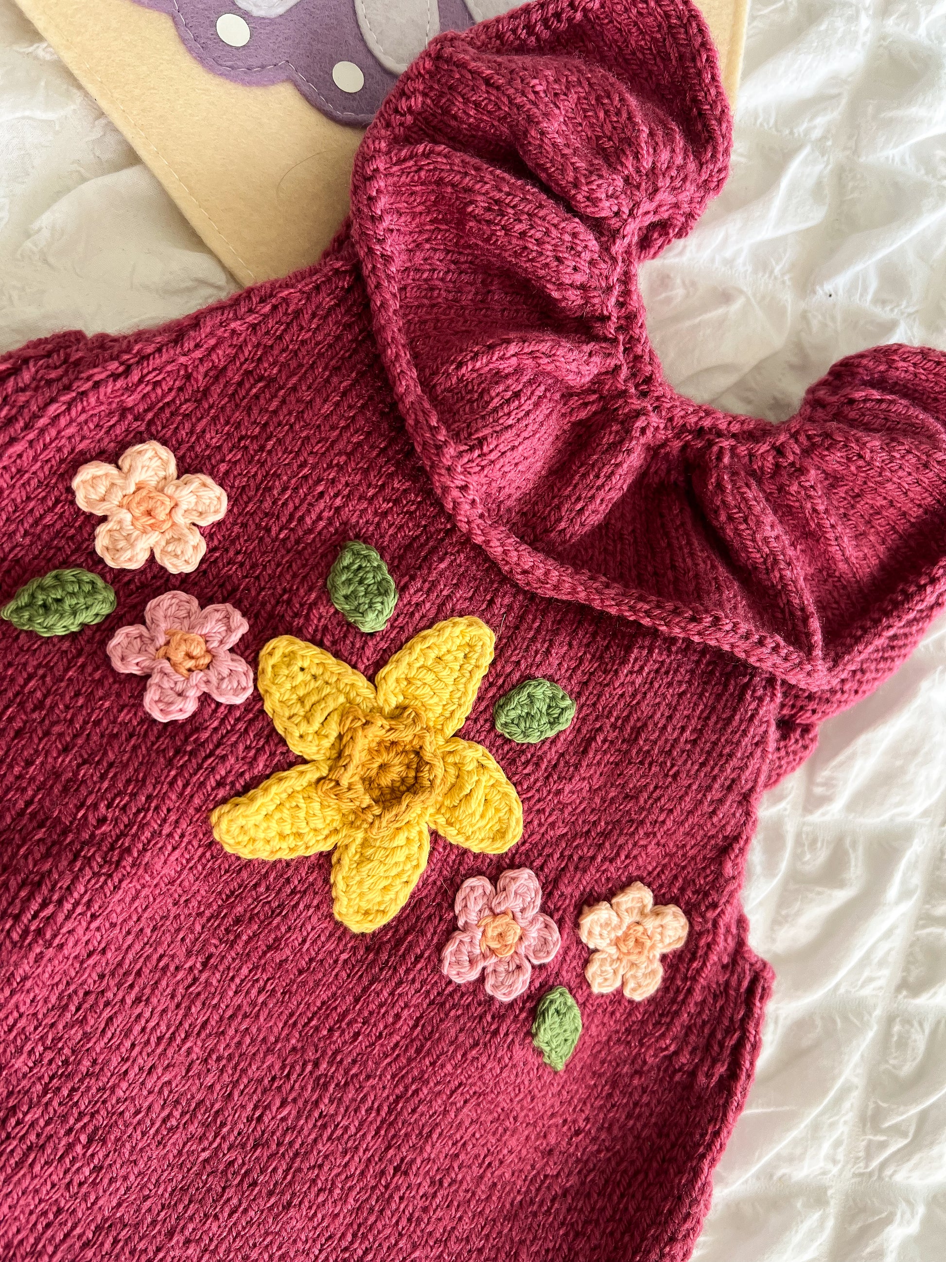 This gorgeous romper in a raspberry colour has been upcycled with a daffodil and floral appliqués. Romper is a 6-9 month size.