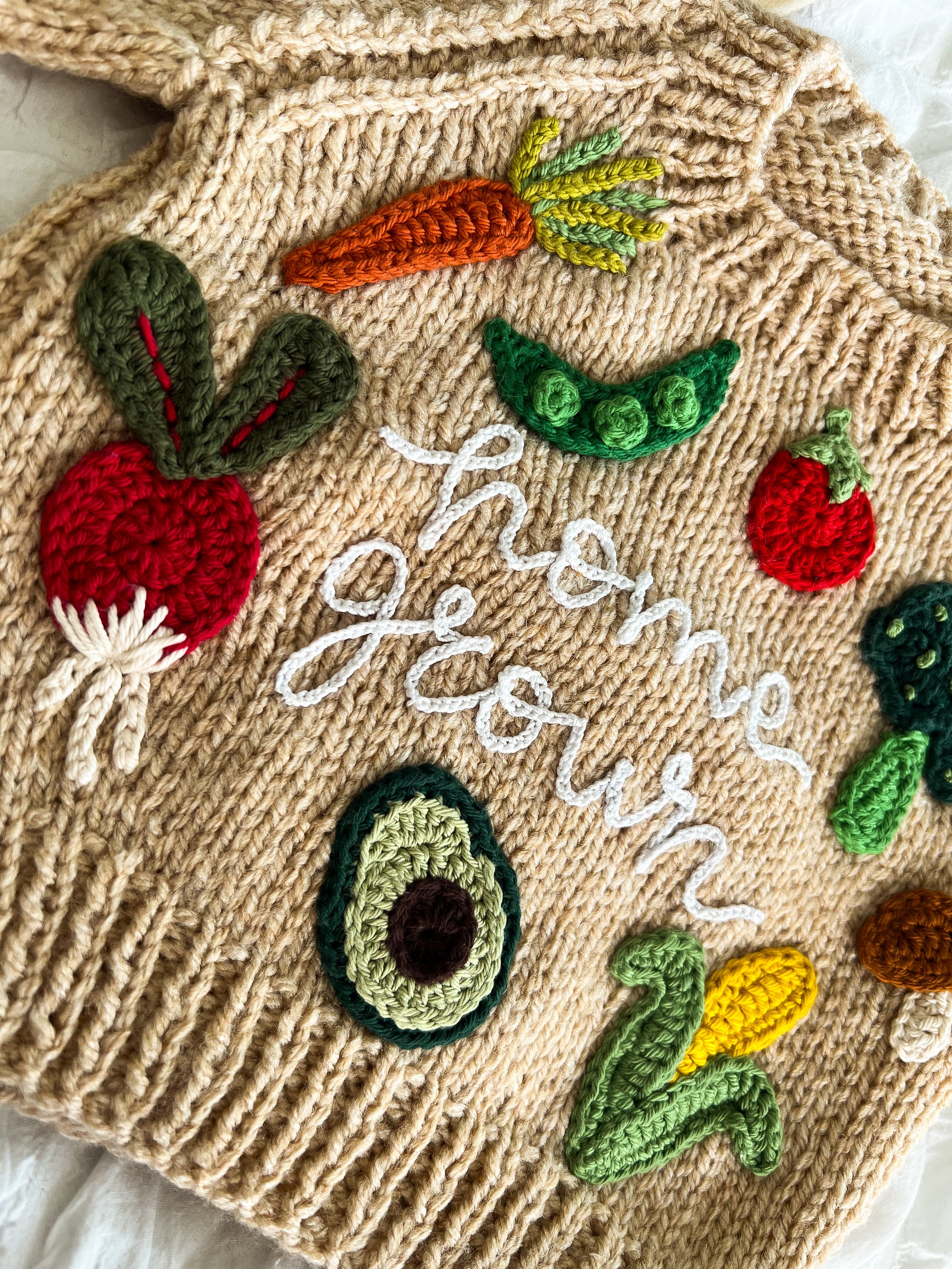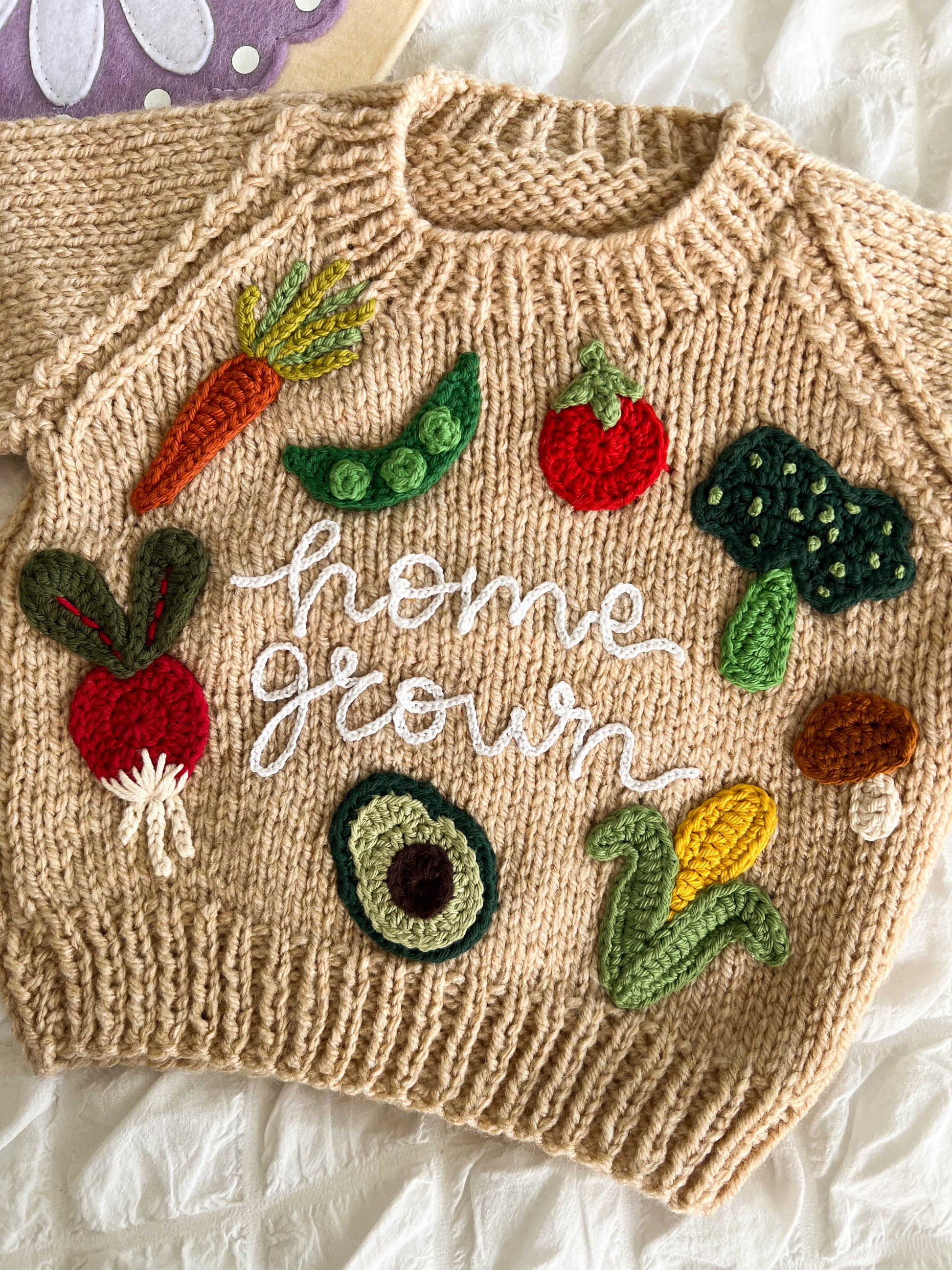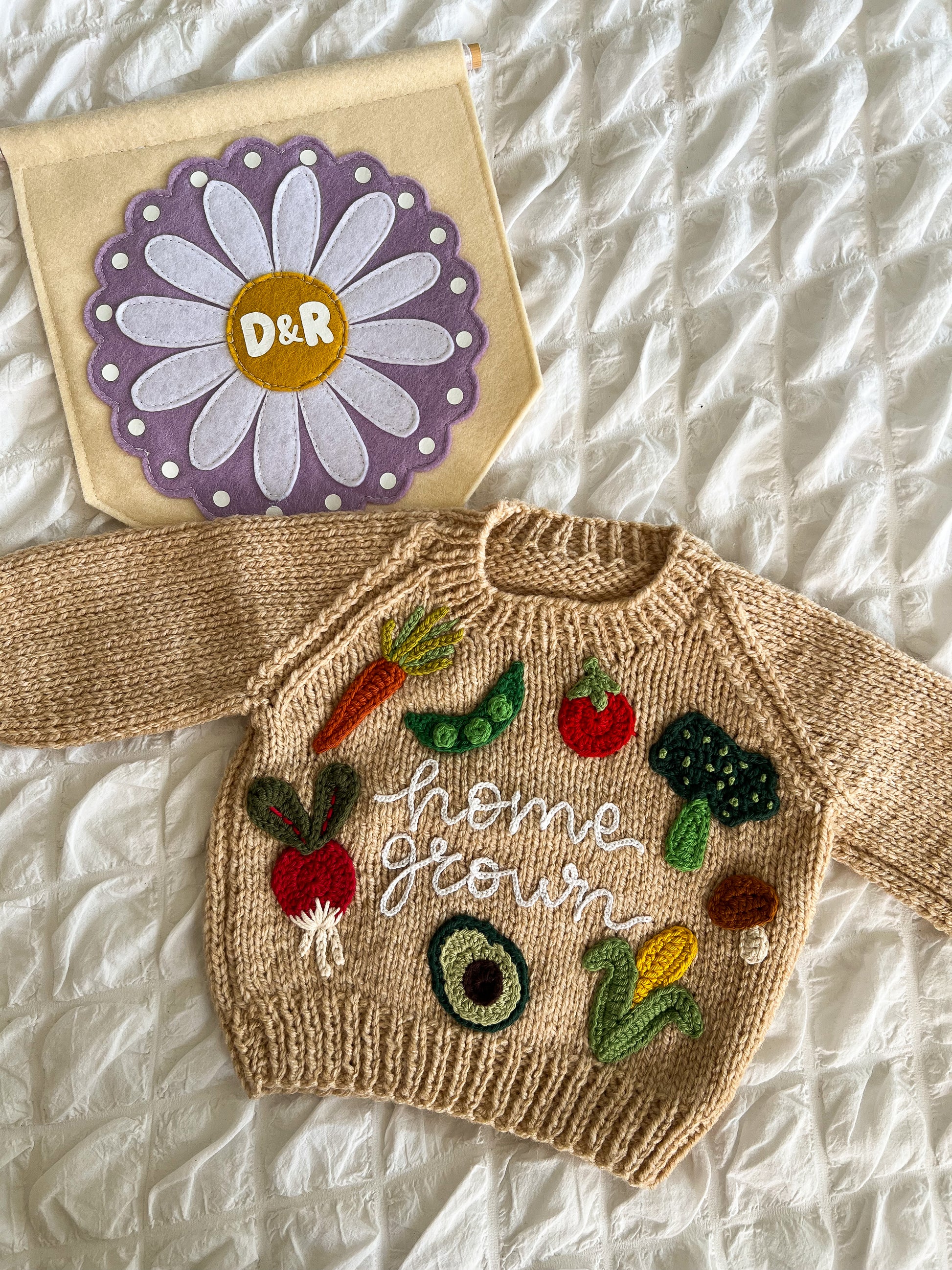 This jumper features our veggie design in miniature with ‘home grown’ lettering. This gorgeous handknitted jumper is a caramel beige in 0-3 months size.