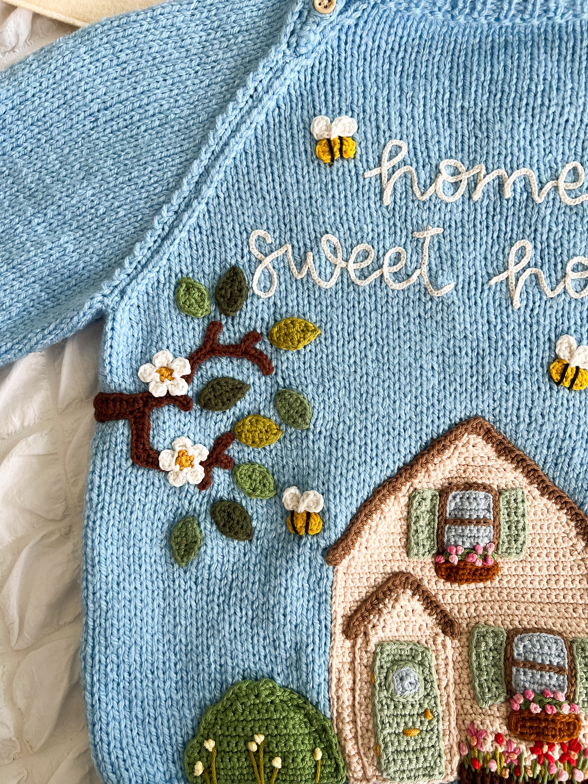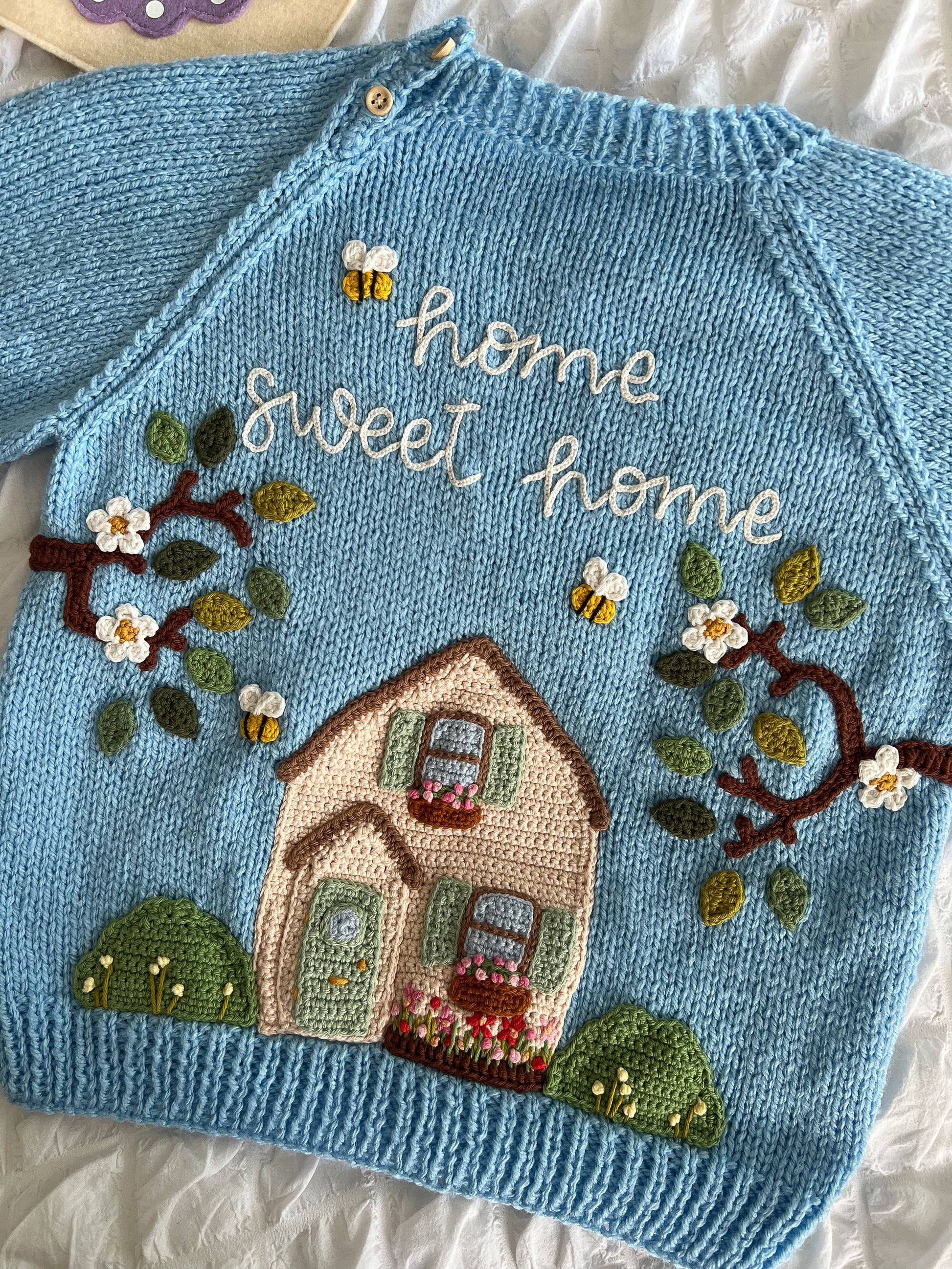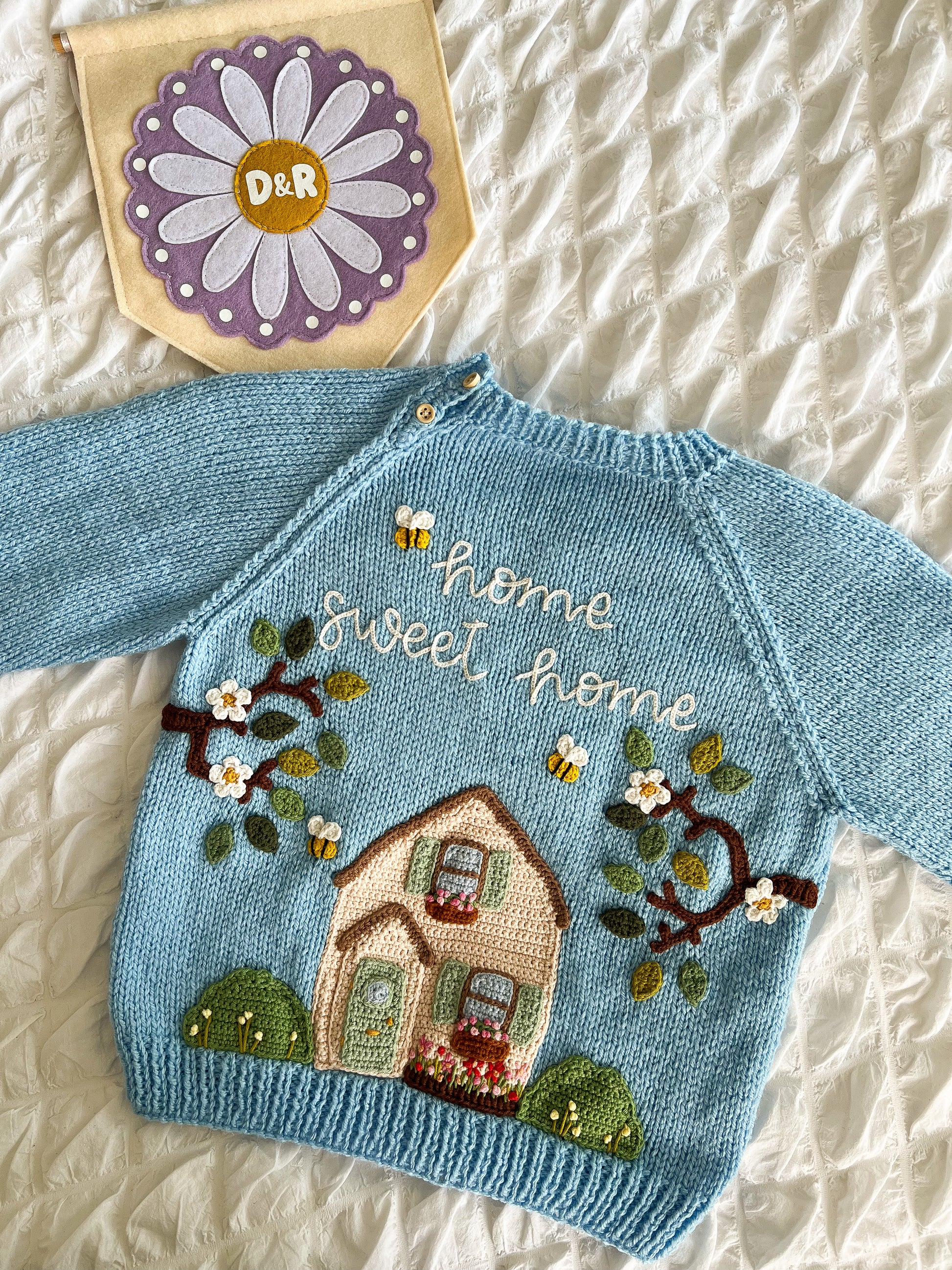 This jumper has a charming cottage design with lettering ‘home sweet home’. This gorgeous handknitted jumper in a sky blue is a generous 3-4 year.