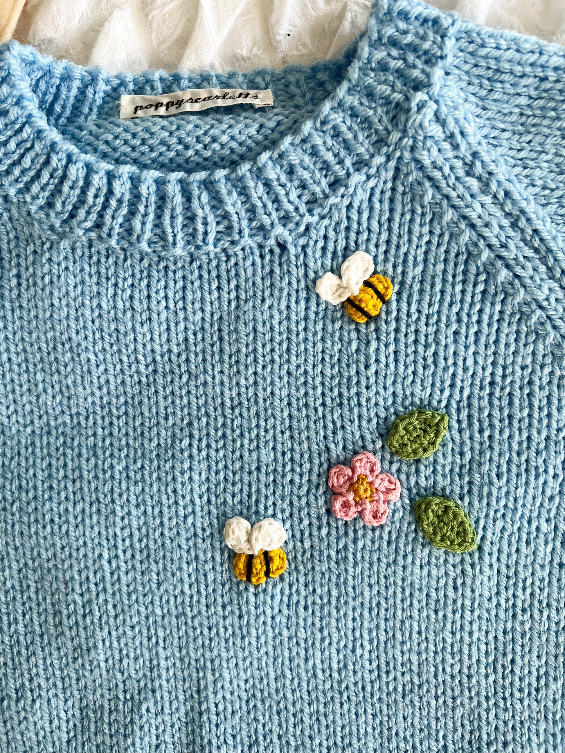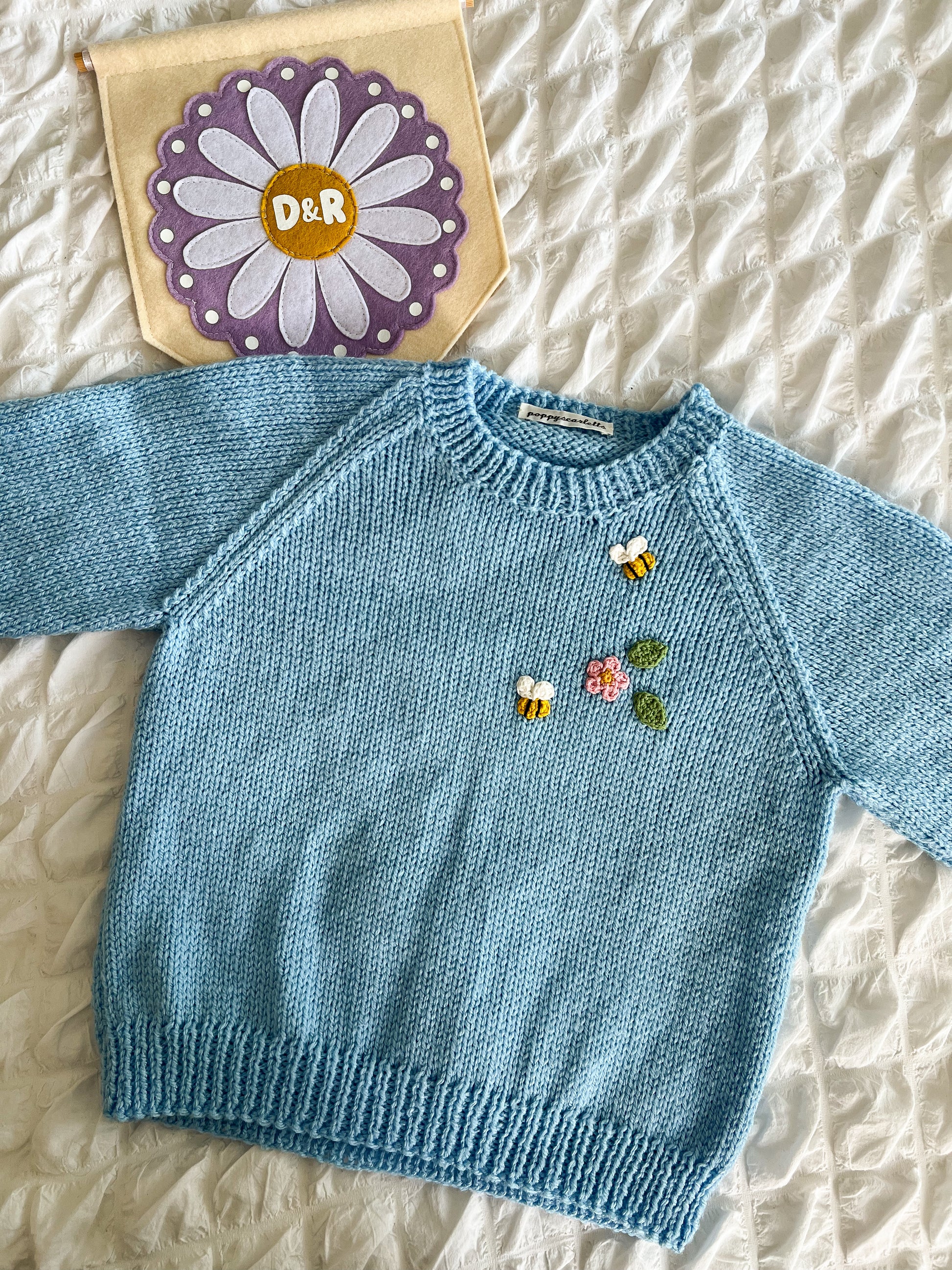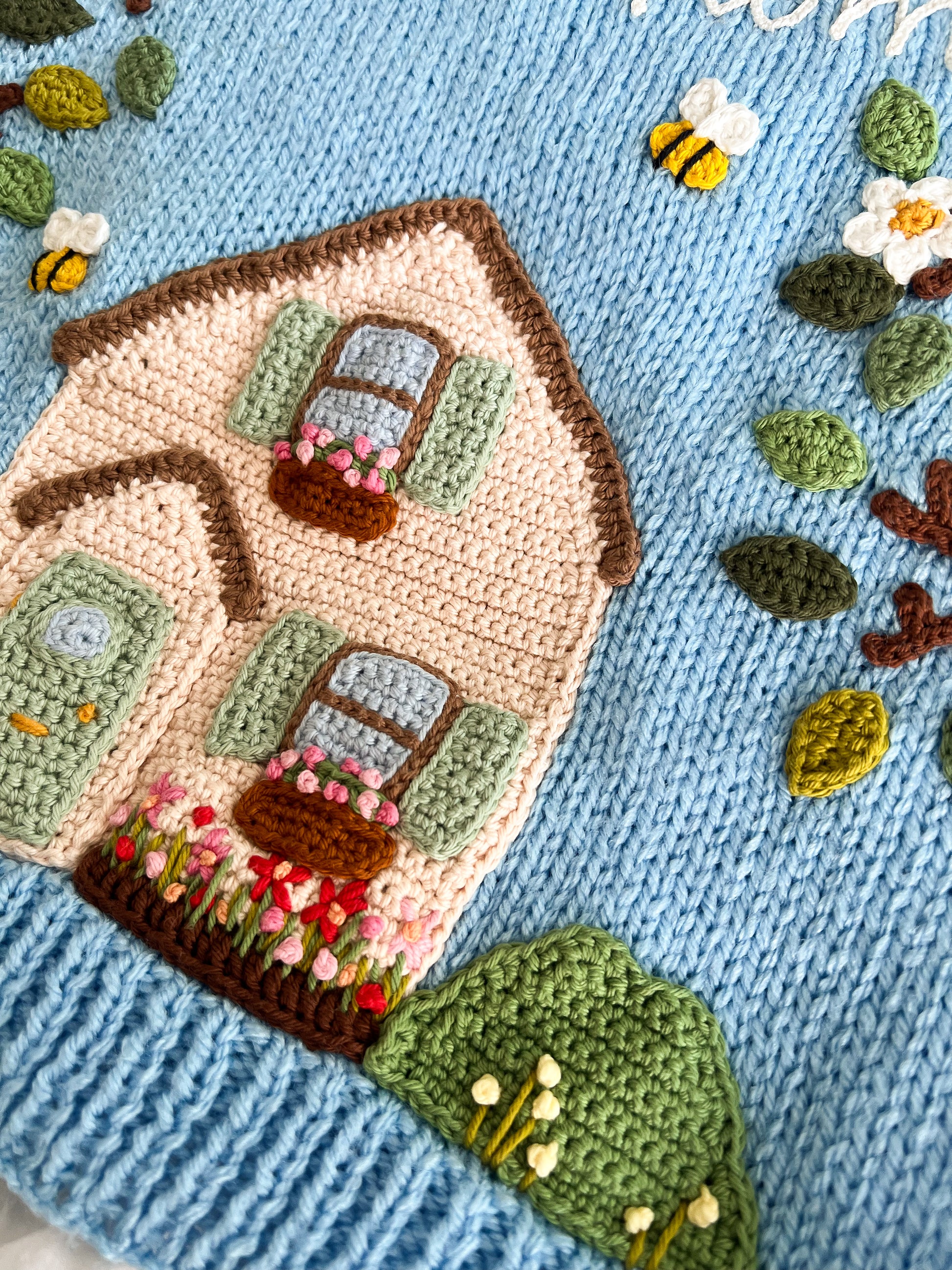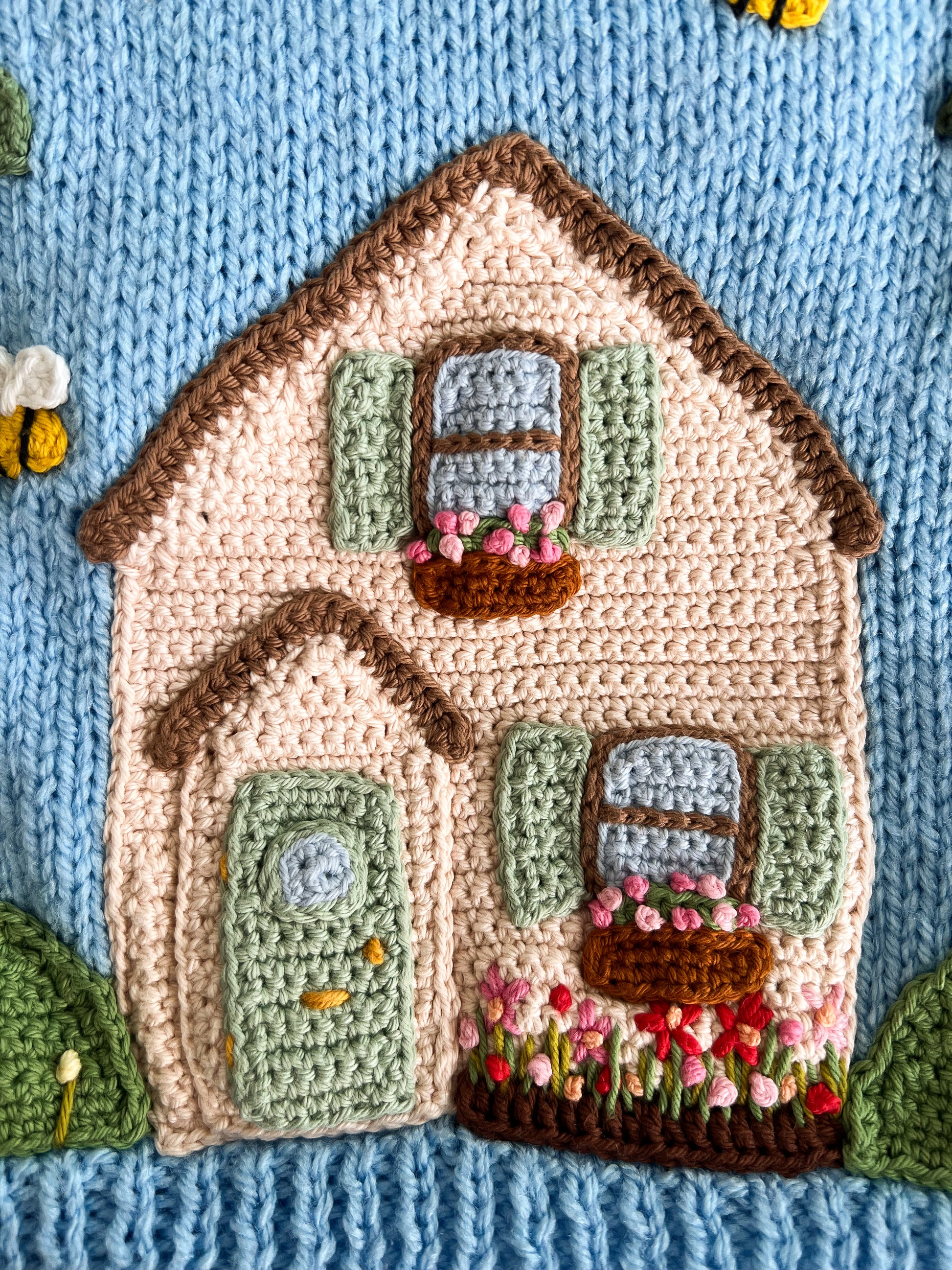 This jumper has a charming cottage design with lettering ‘home sweet home’. This gorgeous handknitted jumper in a sky blue is a generous 3-4 year.