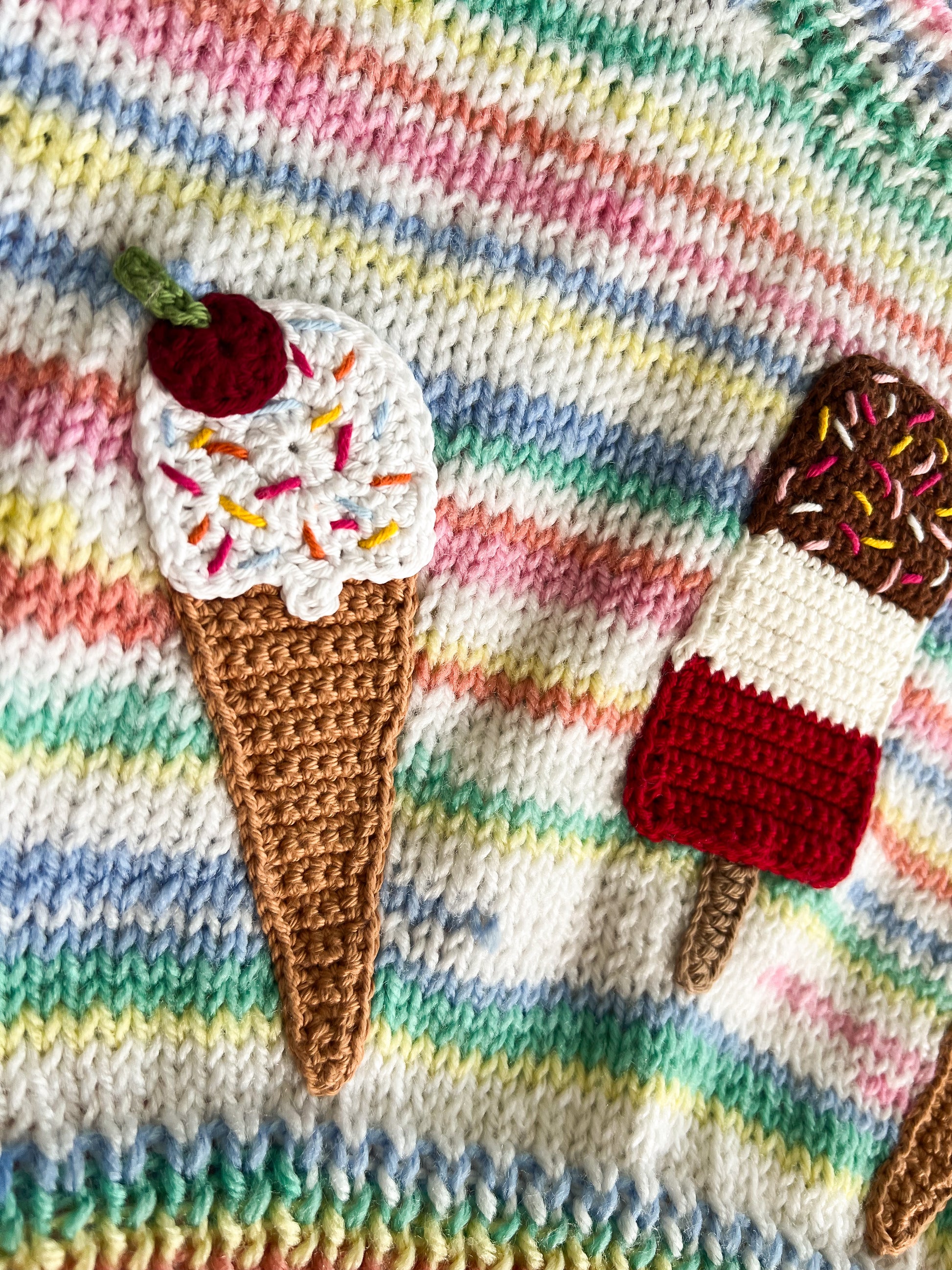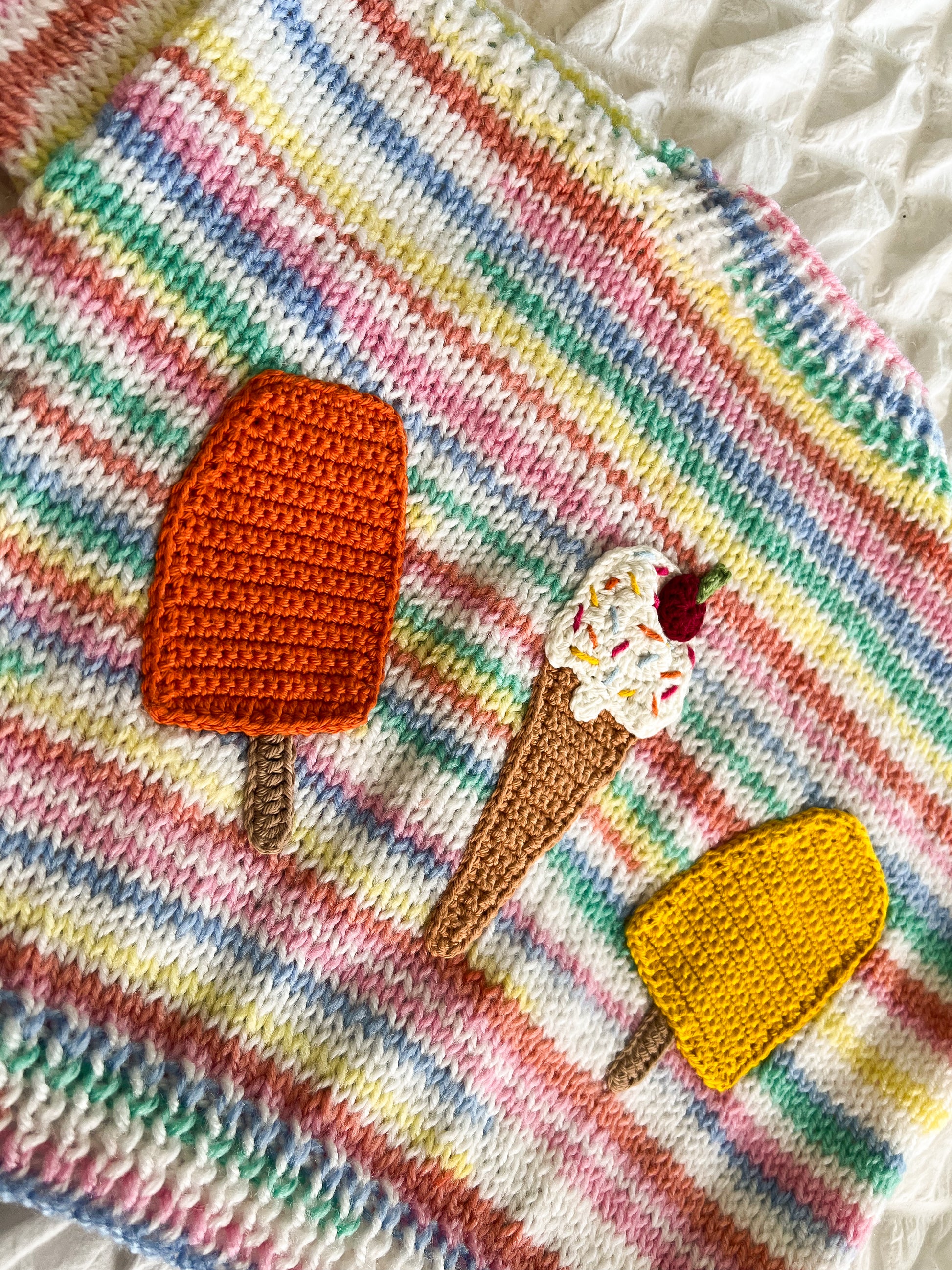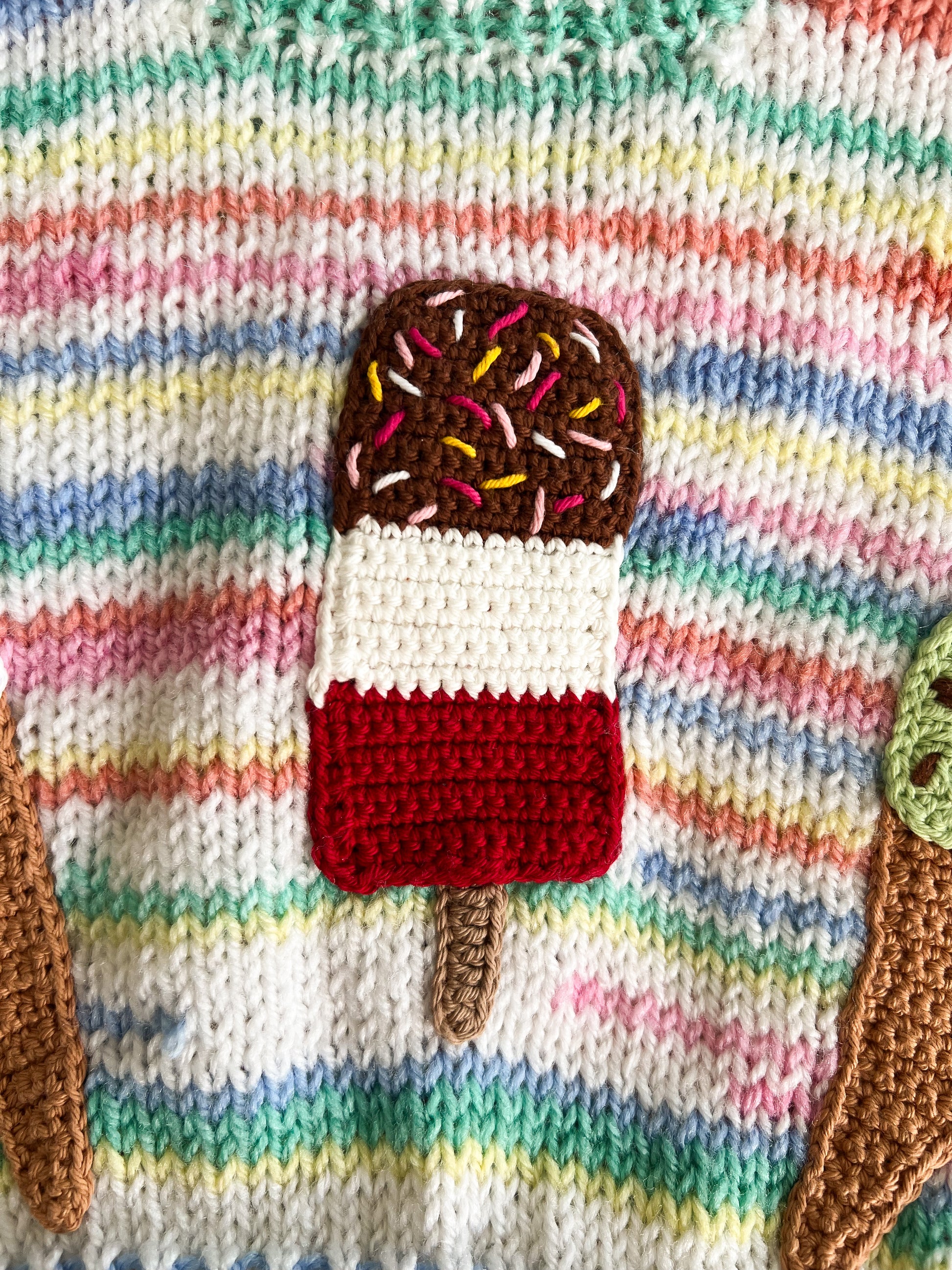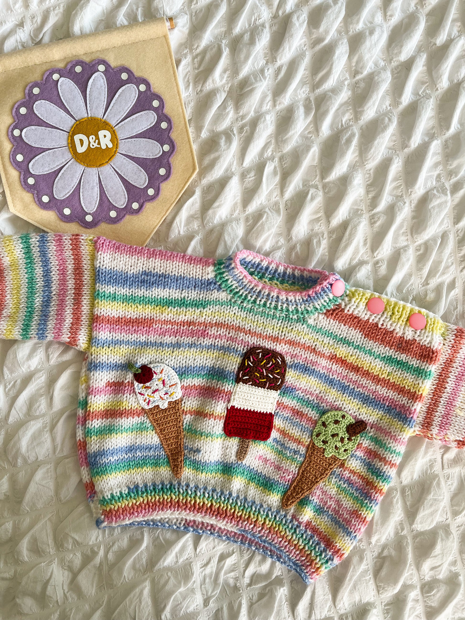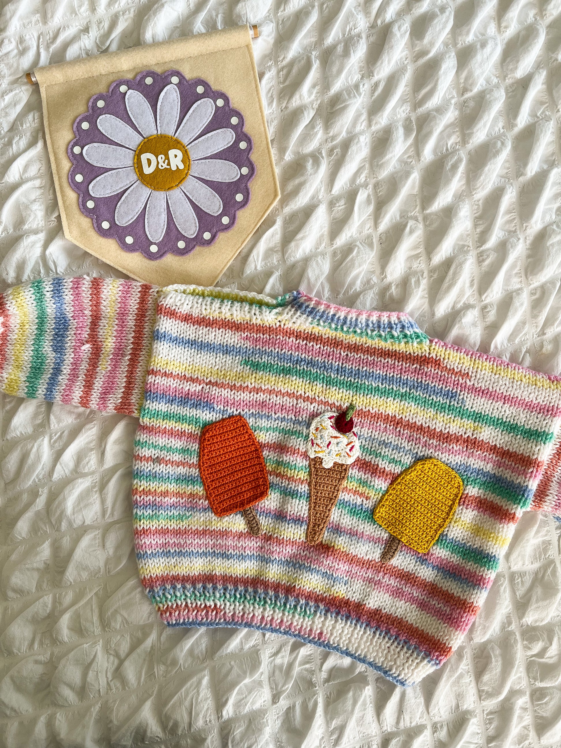 This super fun striped jumper has been up cycled with detailed ice cream appliqués front and back. Jumper is 12-18 months.