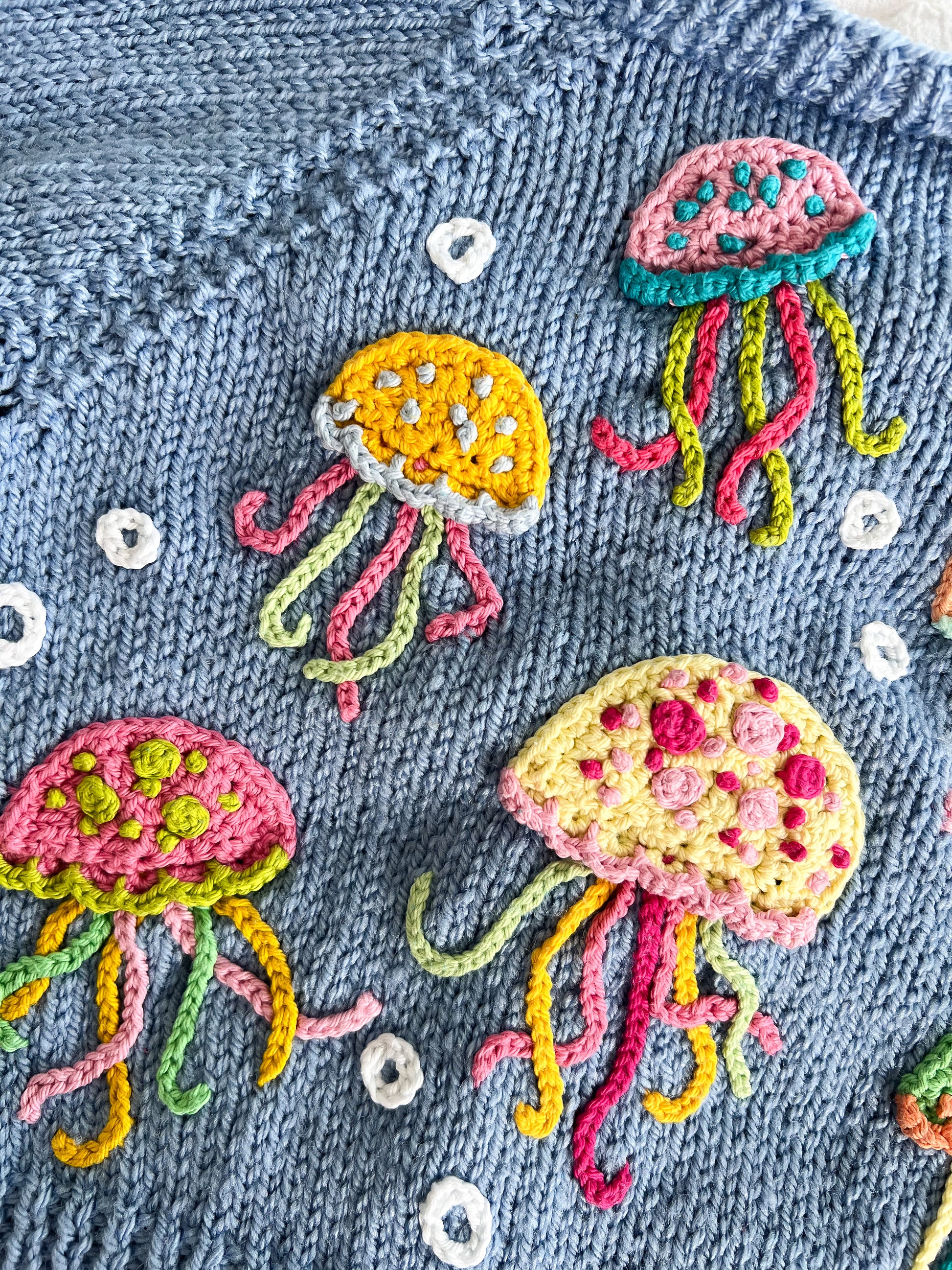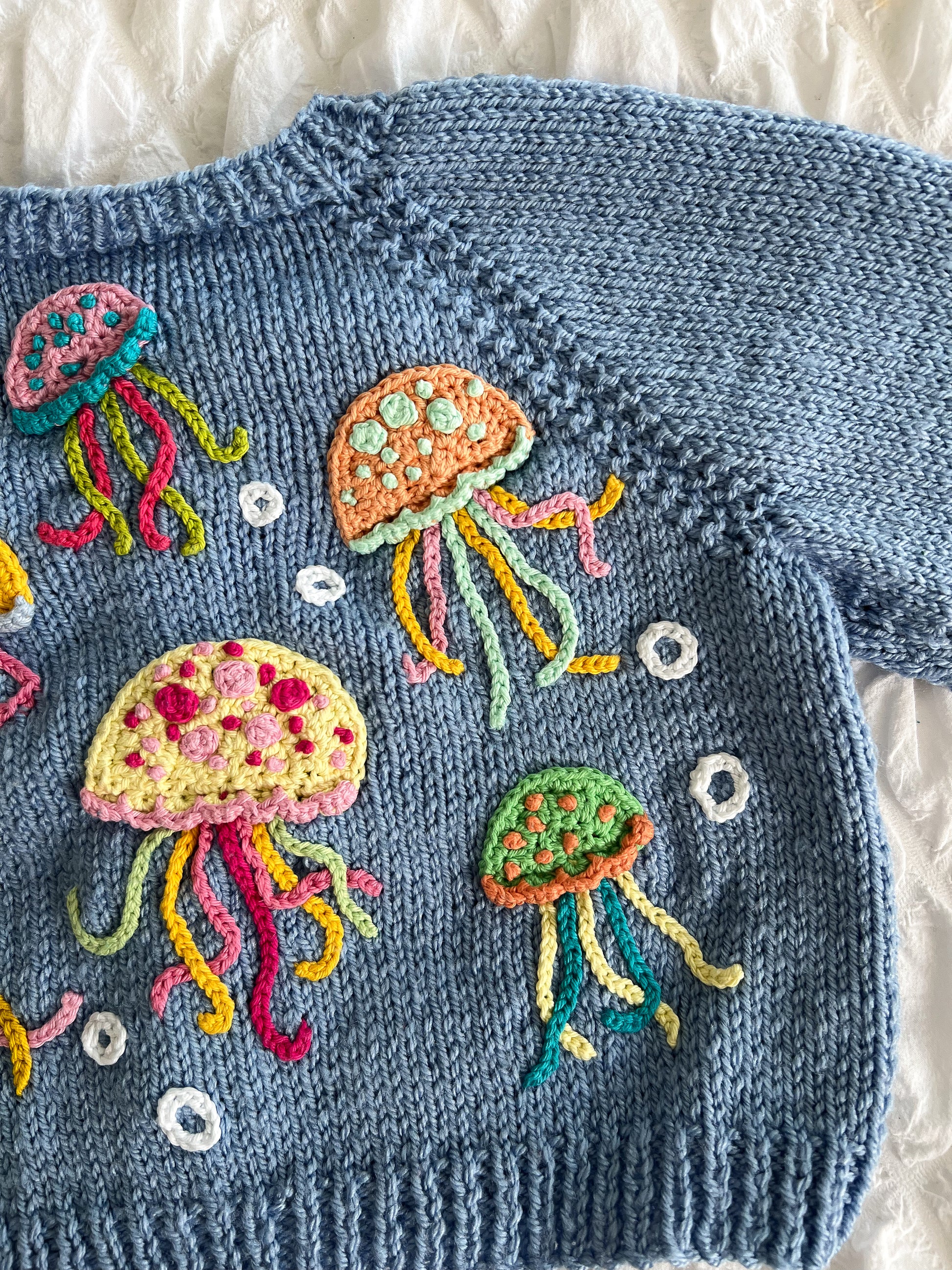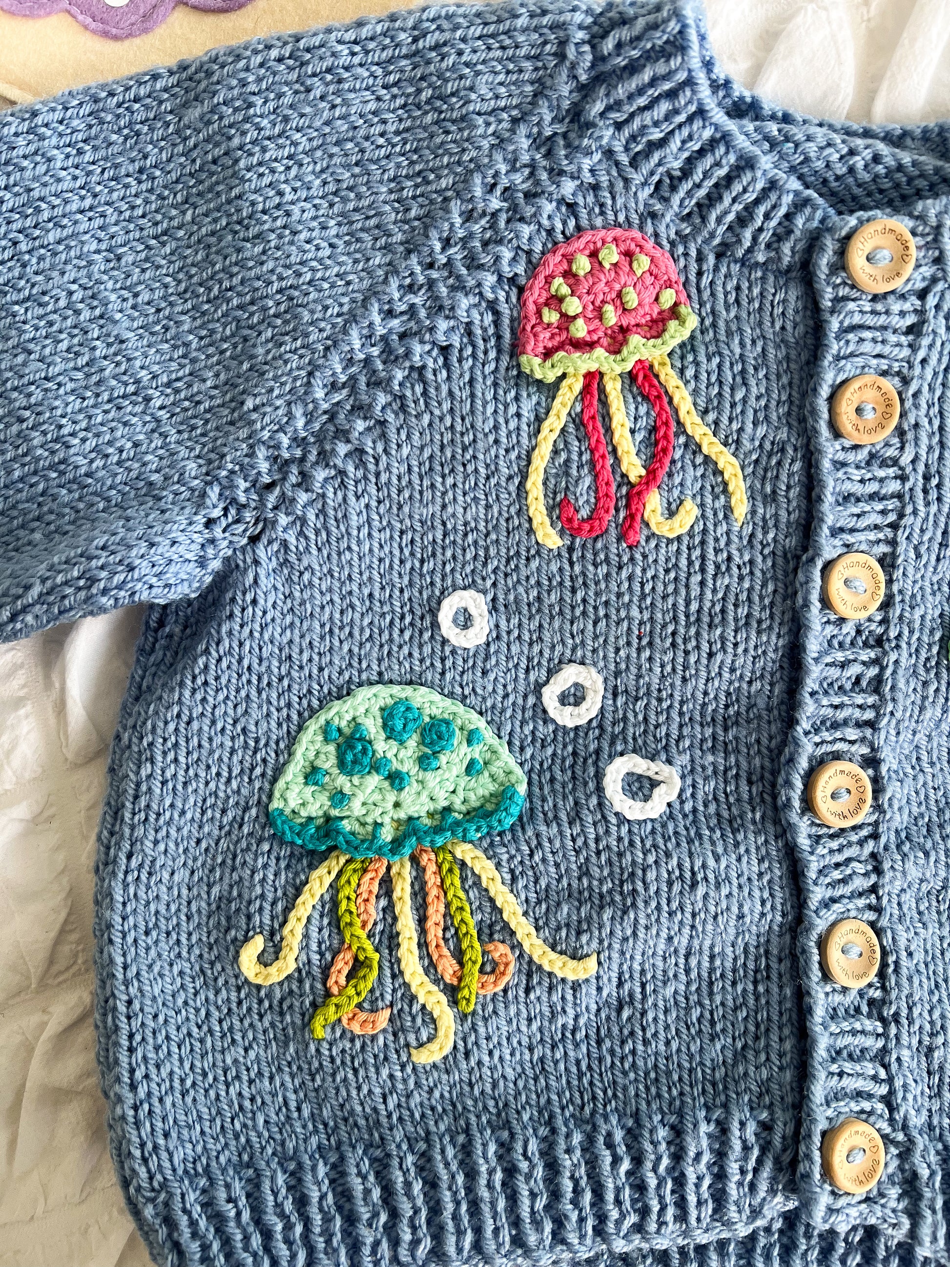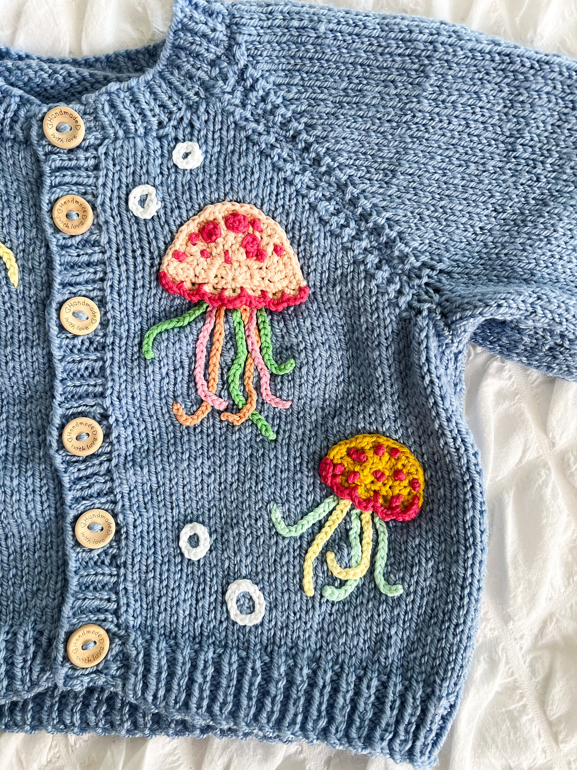 This cardigan has a fun jellyfish design front and back on a gorgeous handknitted cardigan in sky blue in a 1-2 year size.