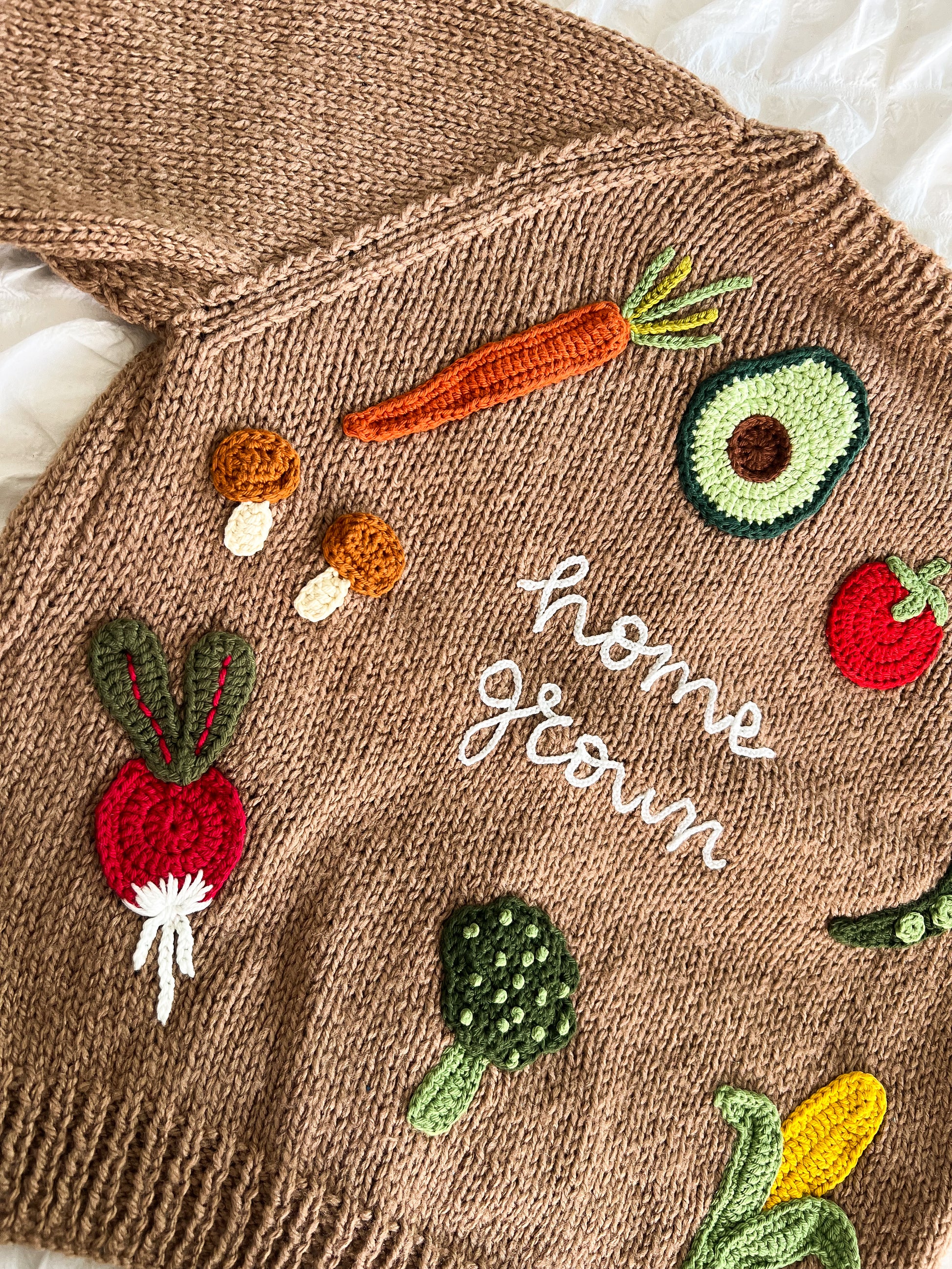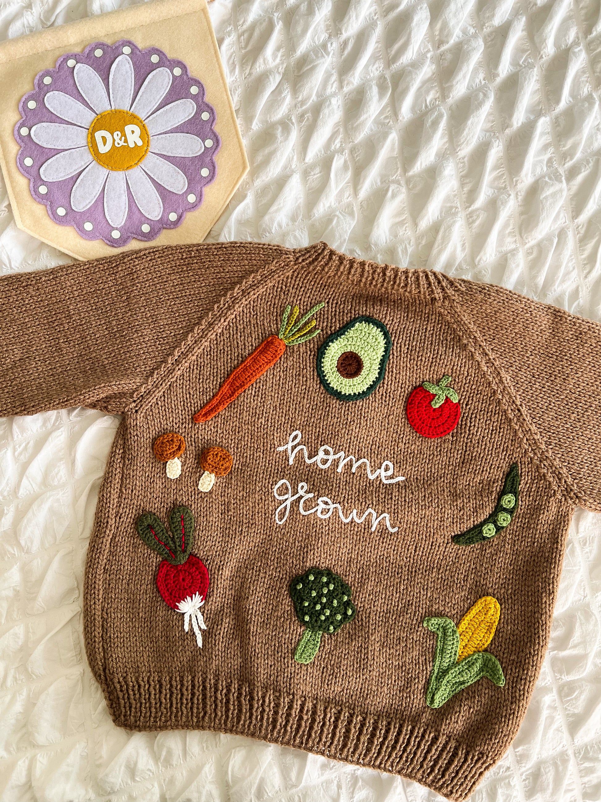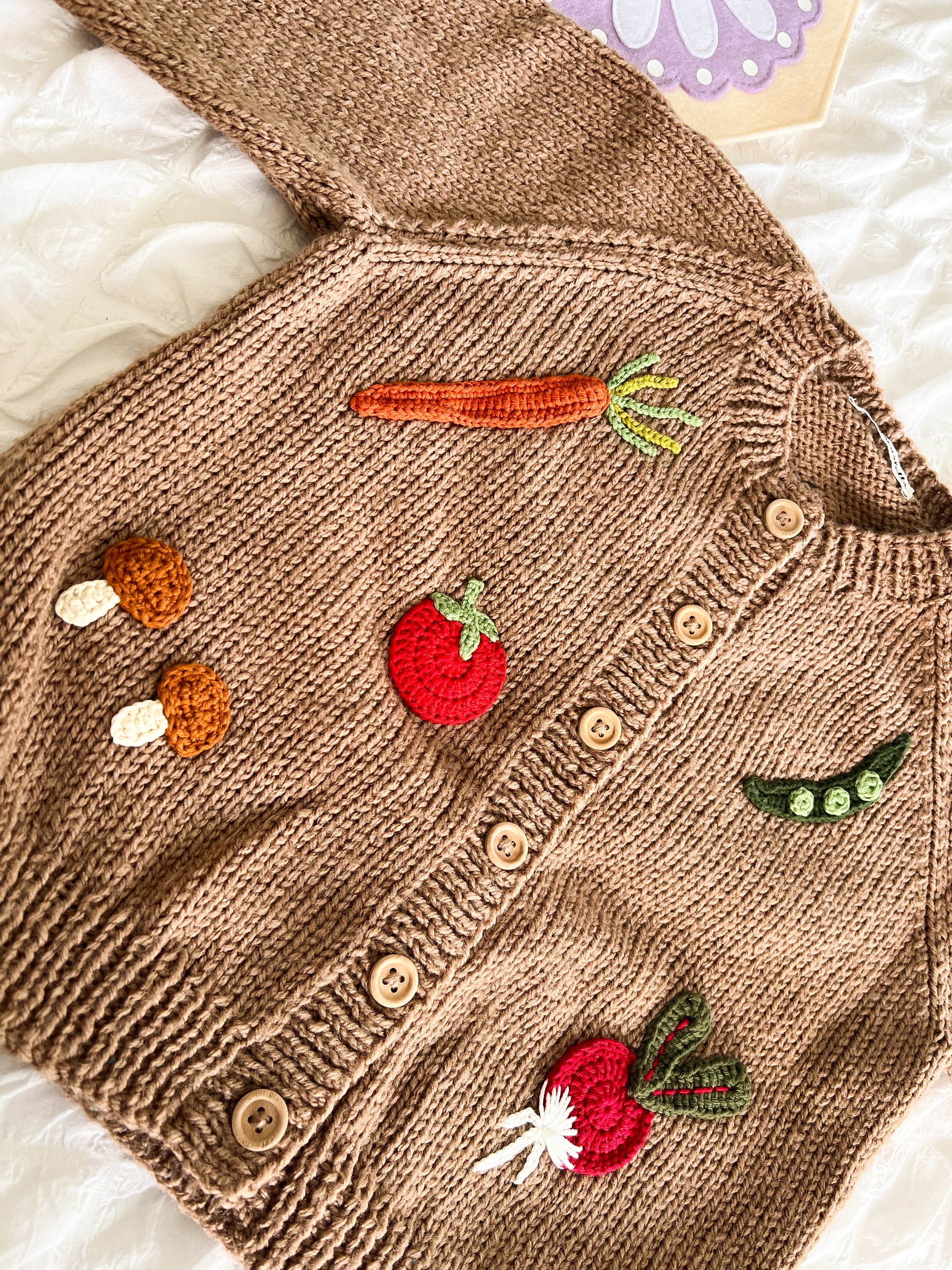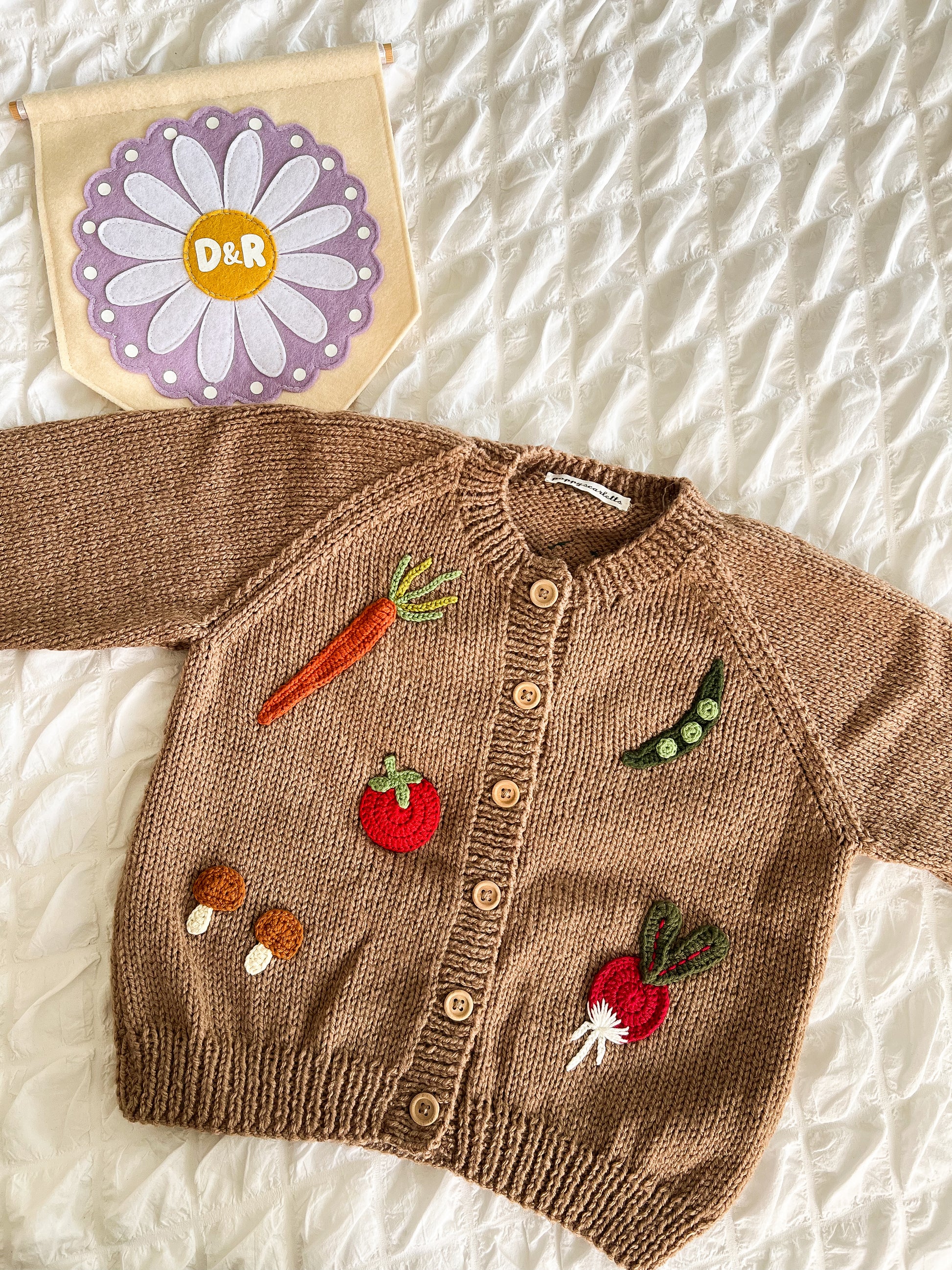 This cardigan features lots of veggies on both the front and back with ‘home grown’ lettering. The gorgeous handknitted cardigan is a lovely rich brown in a generous 3-4 year size.