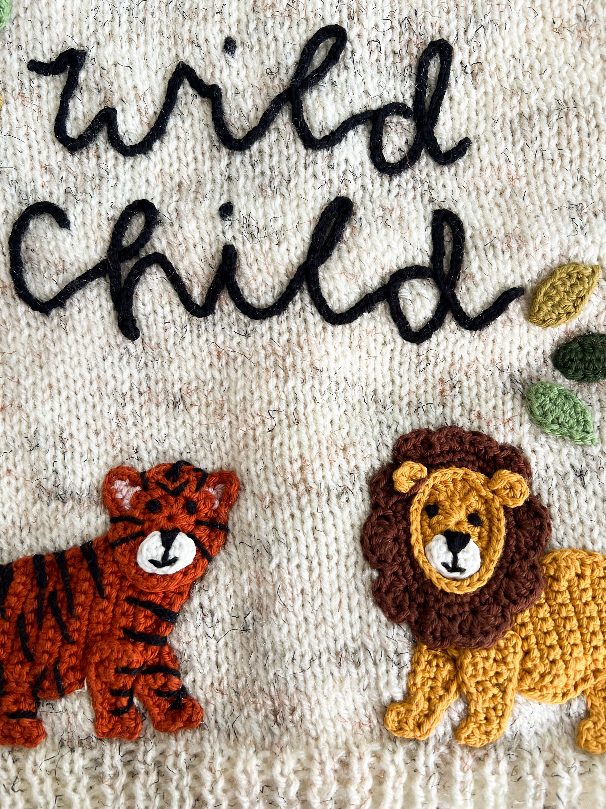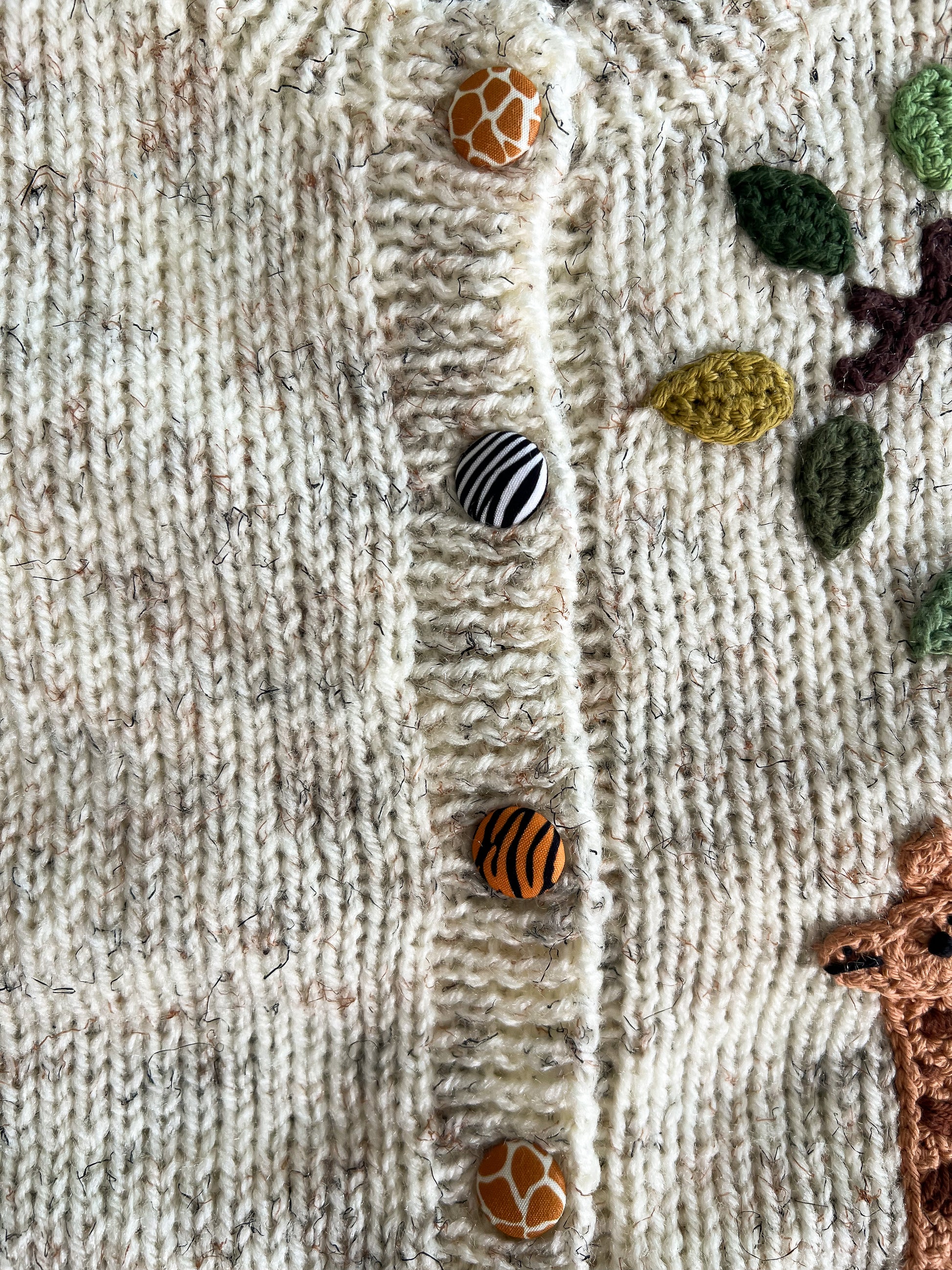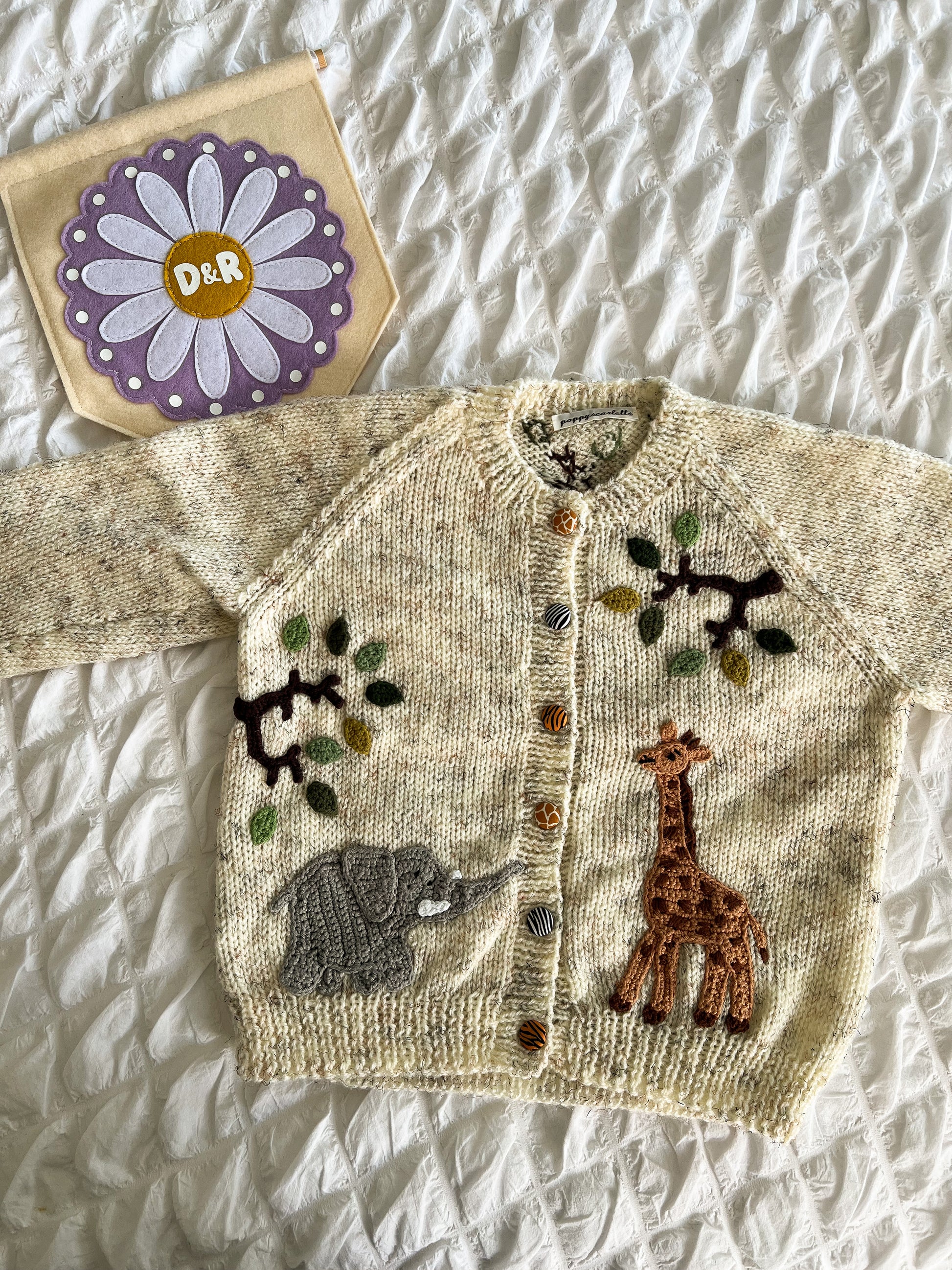 This cardigan has safari animal design with ‘wild child’ lettering on a gorgeous handknitted cardigan in a pale beige with brown and black flecks. Knit is a generous 3-4 year size.