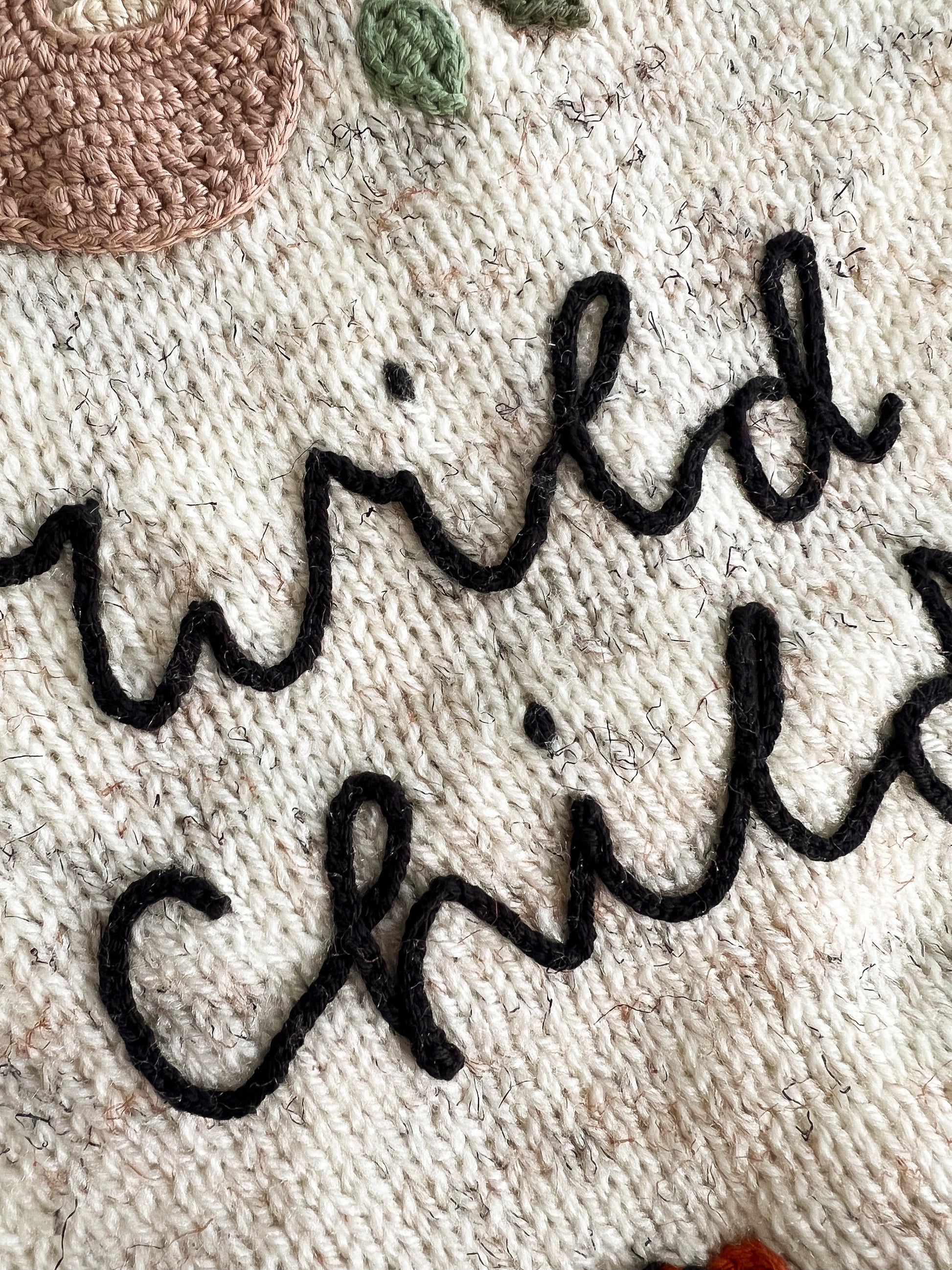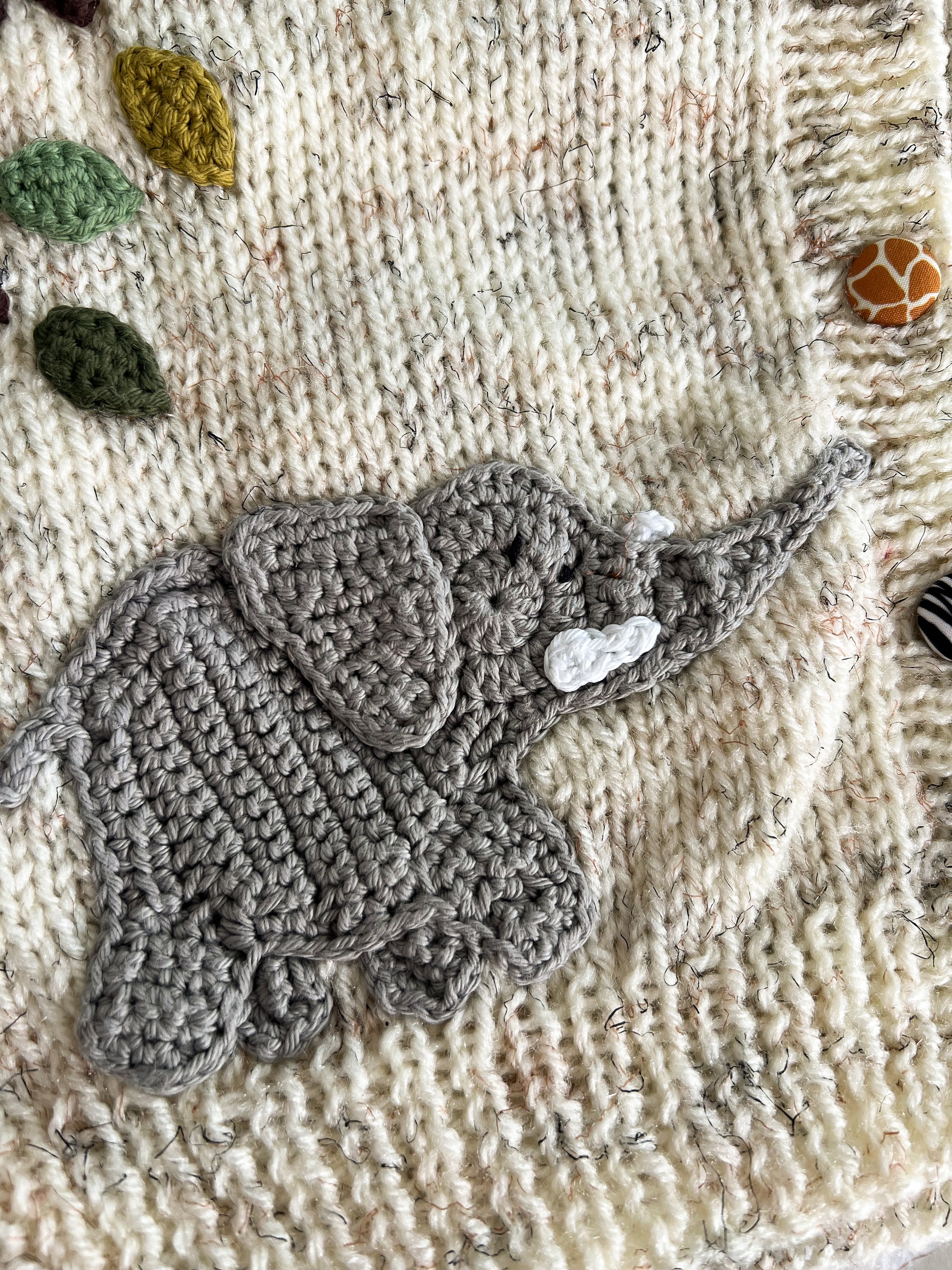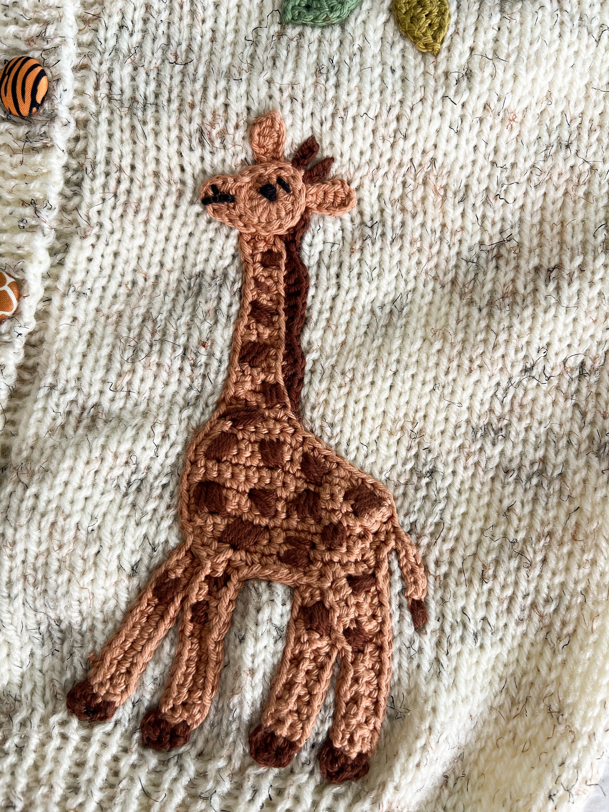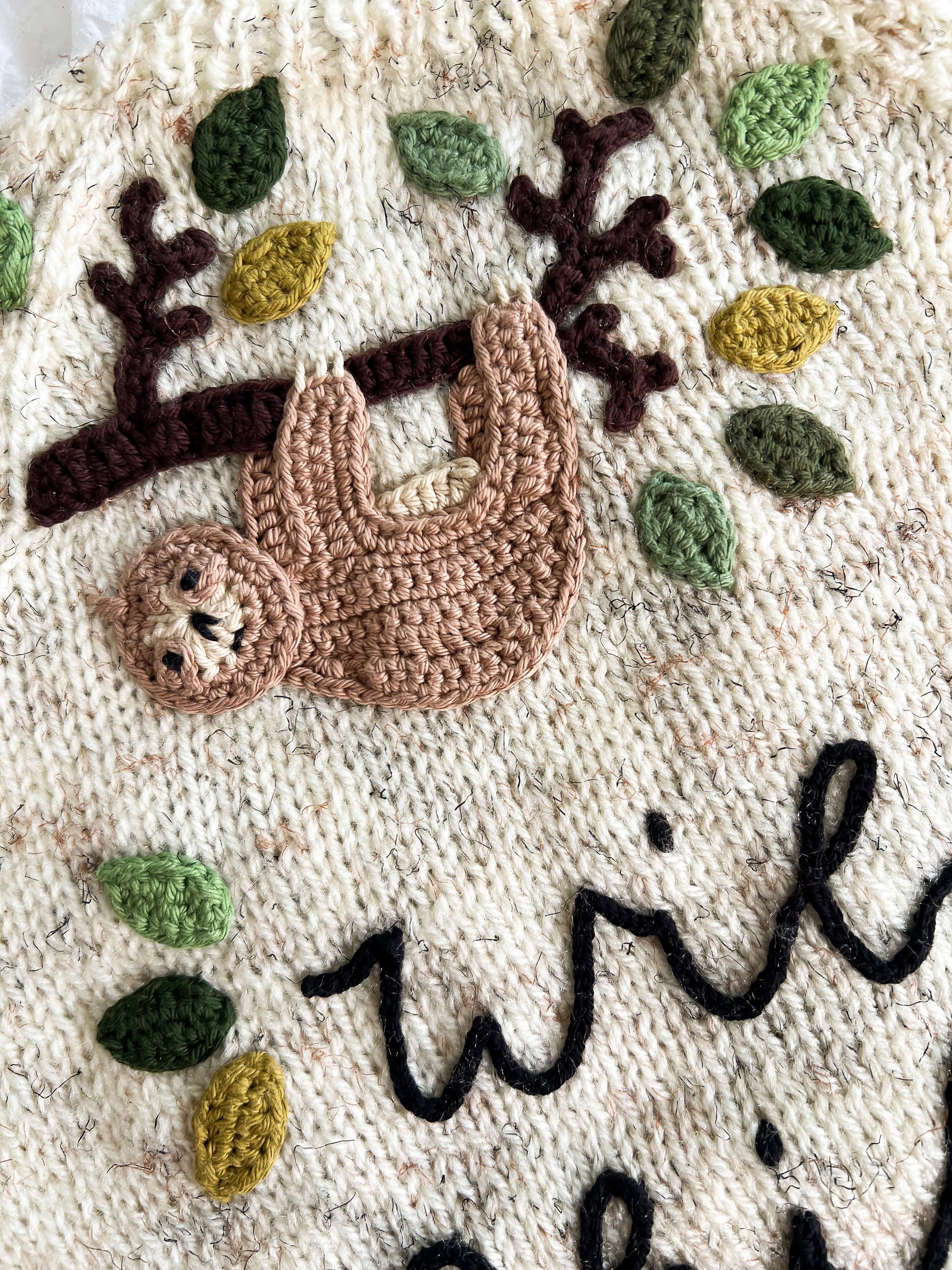 This cardigan has safari animal design with ‘wild child’ lettering on a gorgeous handknitted cardigan in a pale beige with brown and black flecks. Knit is a generous 3-4 year size.